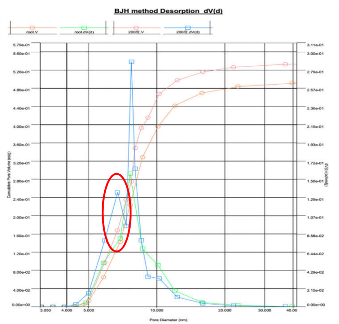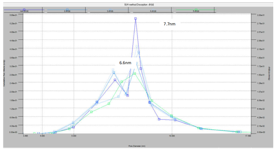 iii.下图为不同脱气条件下的 BJH 脱附孔径分布的对比。可以发现,高温脱气(绿色曲线)使加氢剂孔径分布发生变化,BET 比表面积降低,6.6 的介孔峰(蓝色曲线)消失,总孔体积减少。这说明高温长时间脱气,已经使催化剂孔道发生坍缩和堵塞: