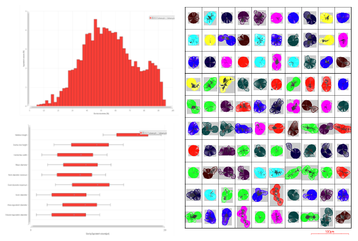 Occhio Scan 700静态图像法粒度粒形分析仪可以提供准确快速的测量。整个实验样品用量少,并可完全回收。可统计测量上万个颗粒。Occhio Callisto3D软件不仅可以提供每个颗粒的长度、宽度及厚度信息,还可以提供了三个层级的粒形分布信息,包括长宽比、椭圆度、Wadell球形度,Wadell圆润度,凹度、凸度、钝度、粗糙度以及颜色等多达八十种的粒径粒形参数,从多个参数角度来描述月壤颗粒的形状特性。