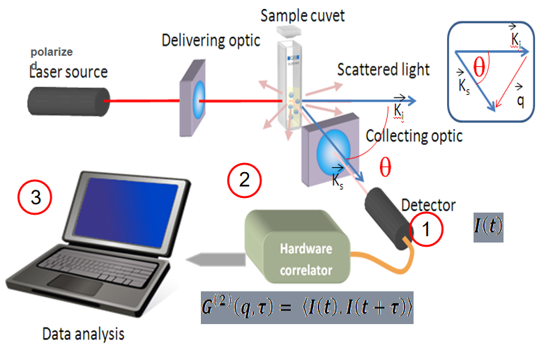 光信号与粒径的关系:光通过胶体时,粒子会将光散射,在一定角度下可以检测到光信号,所检测到的信号是多个散射光子叠加后的结果,具有统计意义。瞬间光强不是固定值,在某一平均值下波动,但波动振幅与粒子粒径有关。通过光强波动变化和光强相关函数计算出粒径及其分布。