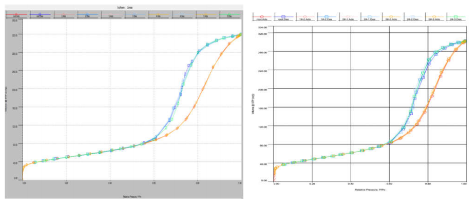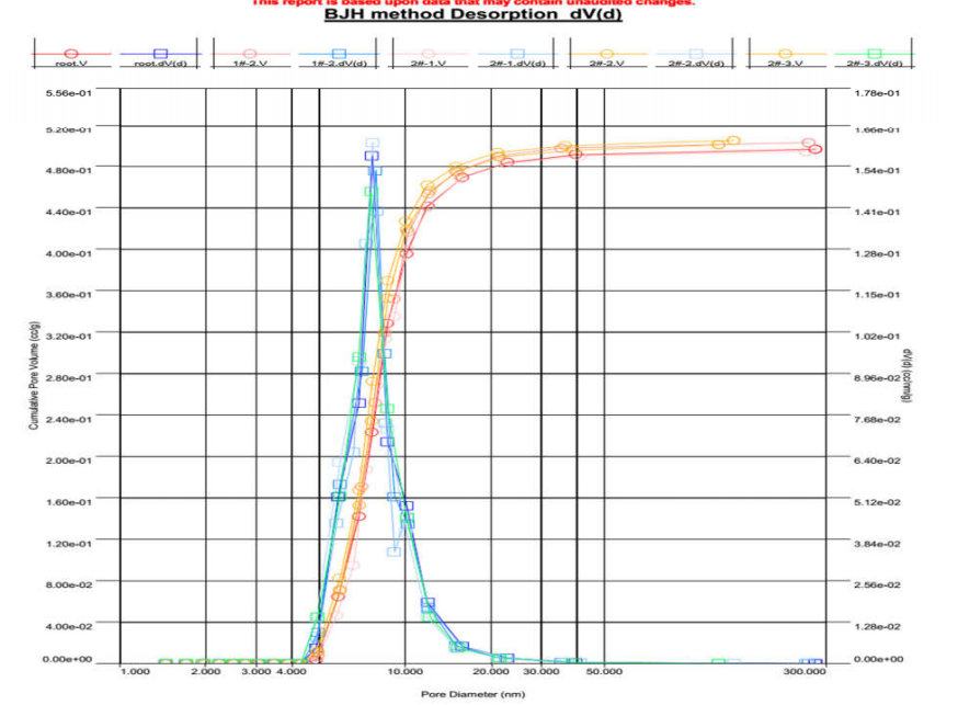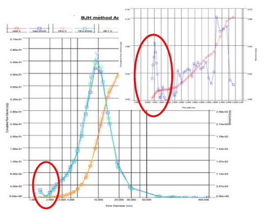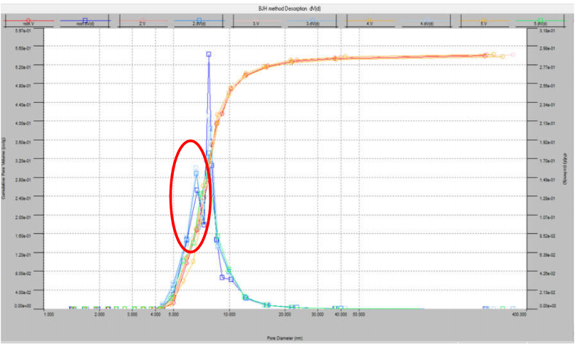 iii.下图为不同脱气条件下的 BJH 脱附孔径分布的对比。可以发现,高温脱气(绿色曲线)使加氢剂孔径分布发生变化,BET 比表面积降低,6.6 的介孔峰(蓝色曲线)消失,总孔体积减少。这说明高温长时间脱气,已经使催化剂孔道发生坍缩和堵塞:
