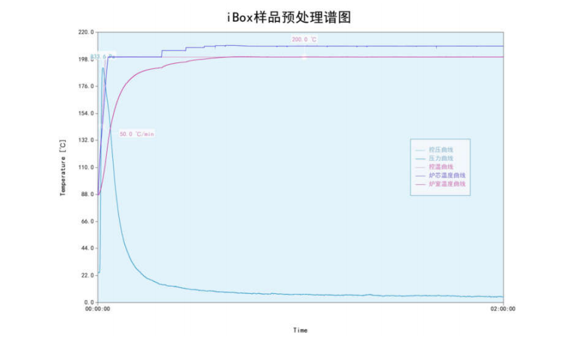 a) 样品称重约0.3g。利用iBox 26全自动智能脱气站按要求进行控温脱气,控温和实际测温曲线及残留气体压力曲线见下图: