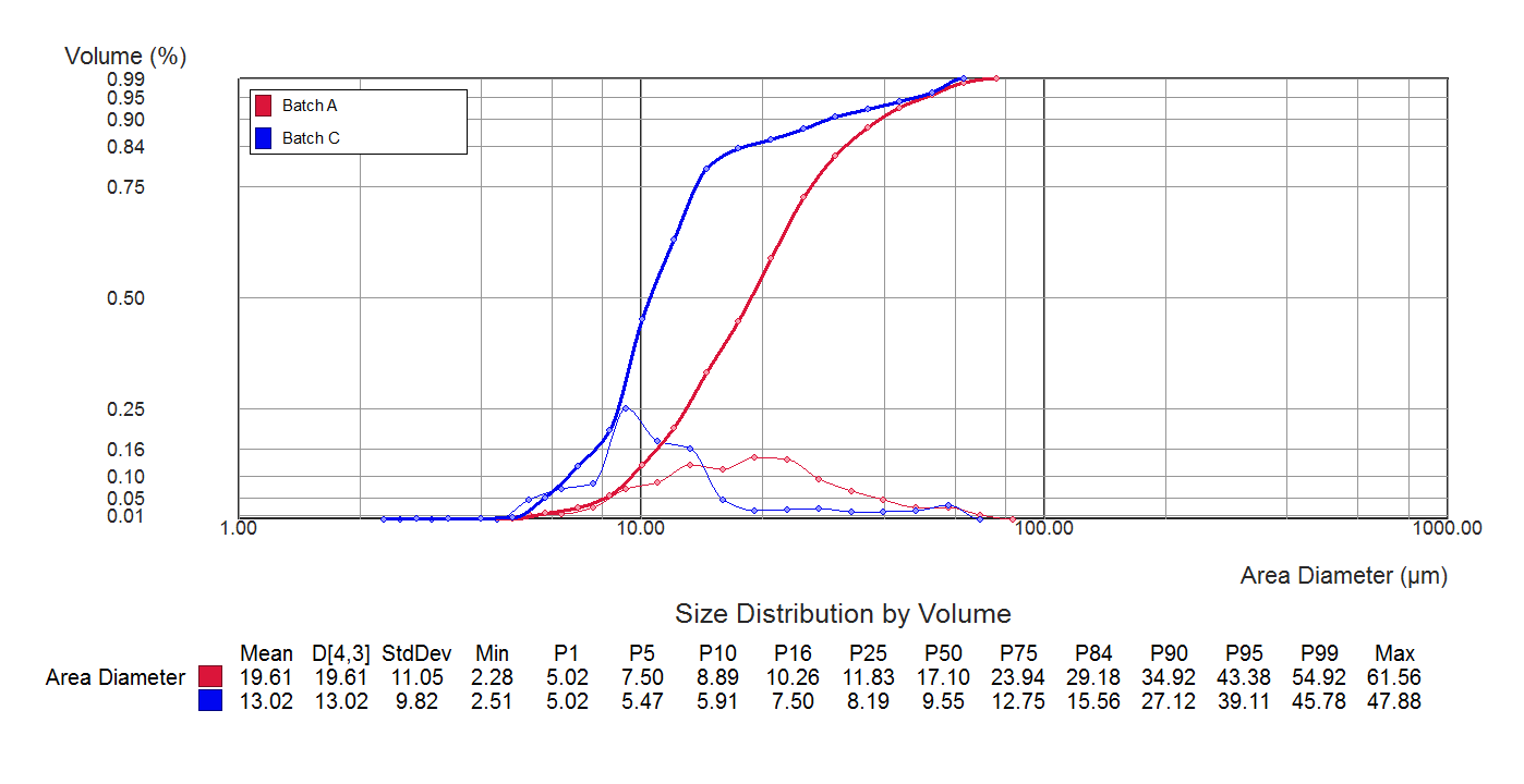 以下的比较显示了一个不符合指标的生产批次产品液滴粒径产生重大降低。