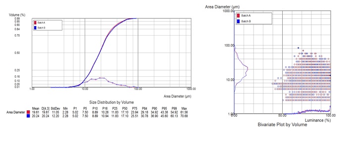以下的比较显示了一个不符合指标的生产批次产品液滴粒径产生重大降低。
